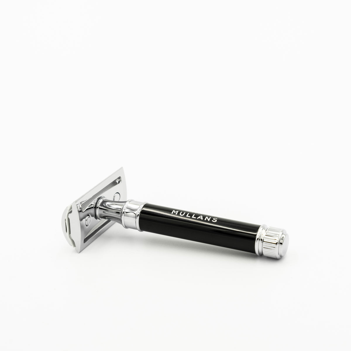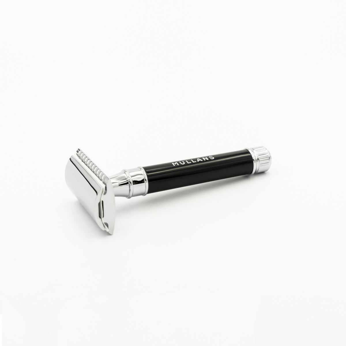 Double edge safety razor with Mr Mullan's logo. Chrome plated with 5 derby blades provided.